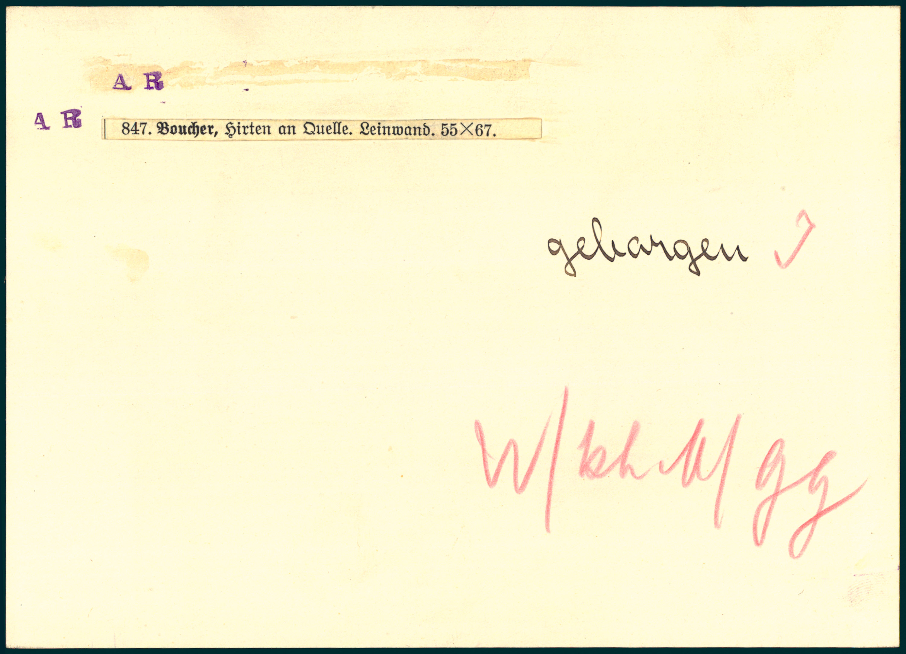 | Karteikarte Annotation | geborgen J W/KhM/GG | Photo Akt geborgen (Kiste A) I Kh.Museum Gemäldegalerie übergeben 13.9.1940 W|KhM|GG |