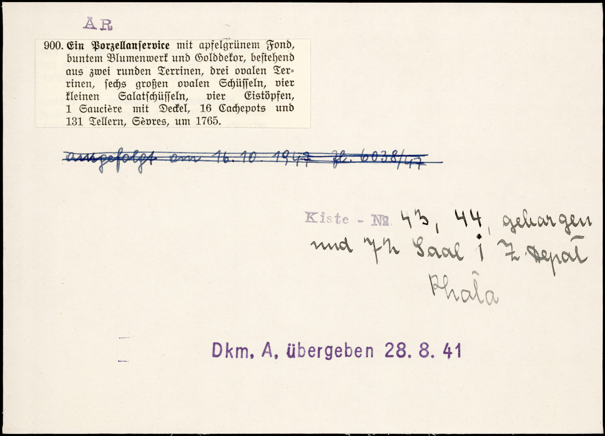 Dkm.A. übergeben 28.8.41 | Kiste - No 43,44, geborgen und 72 Saal i. Z.Depot