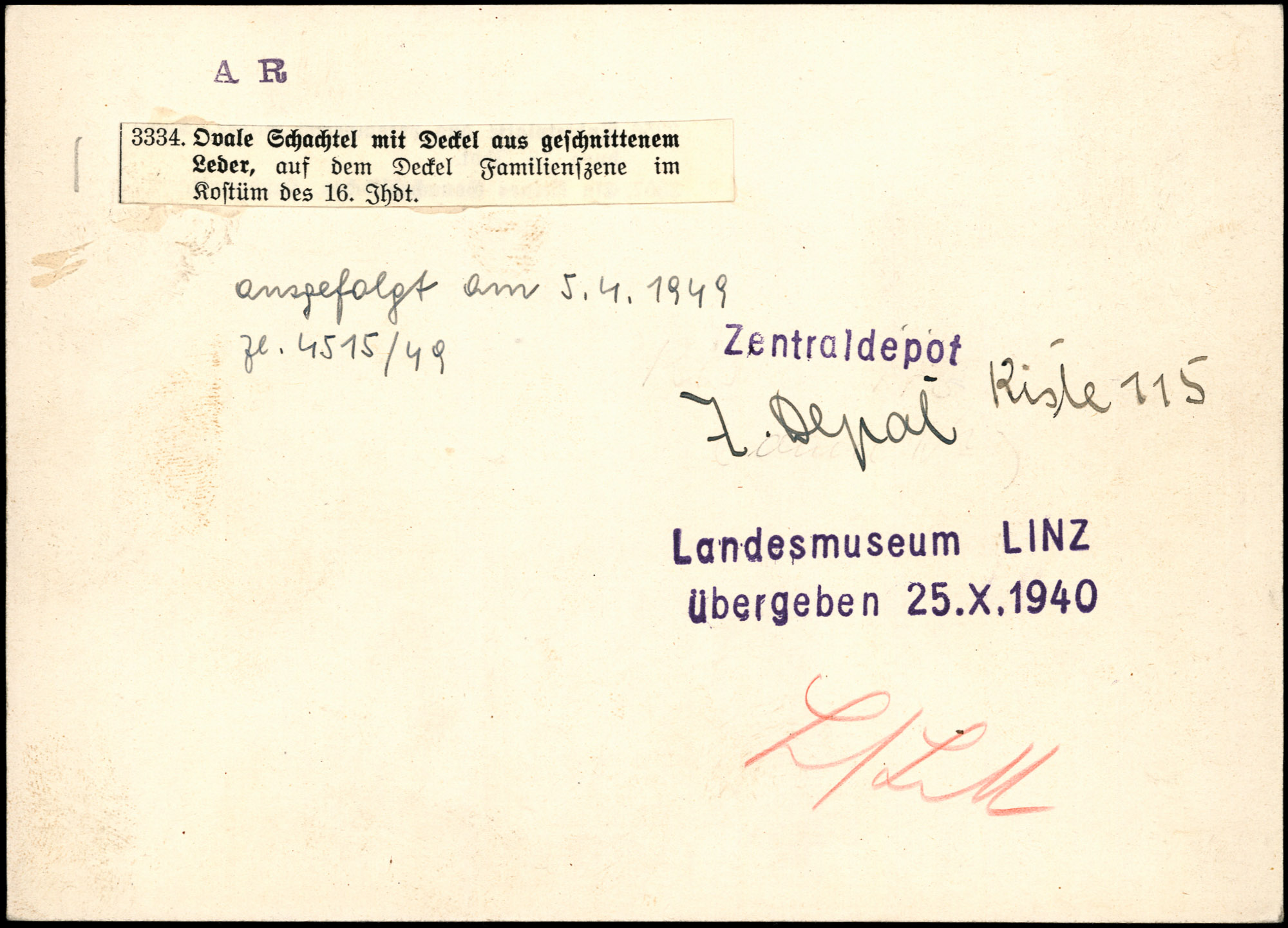 | Karteikarte Annotation | 184 L/LM | ausgefolgt am 5.4.1949 Zl.4515/49 Z.Depot Kiste 115 Landesmuseum Linz übergeben 25.X.1940 L|LM |