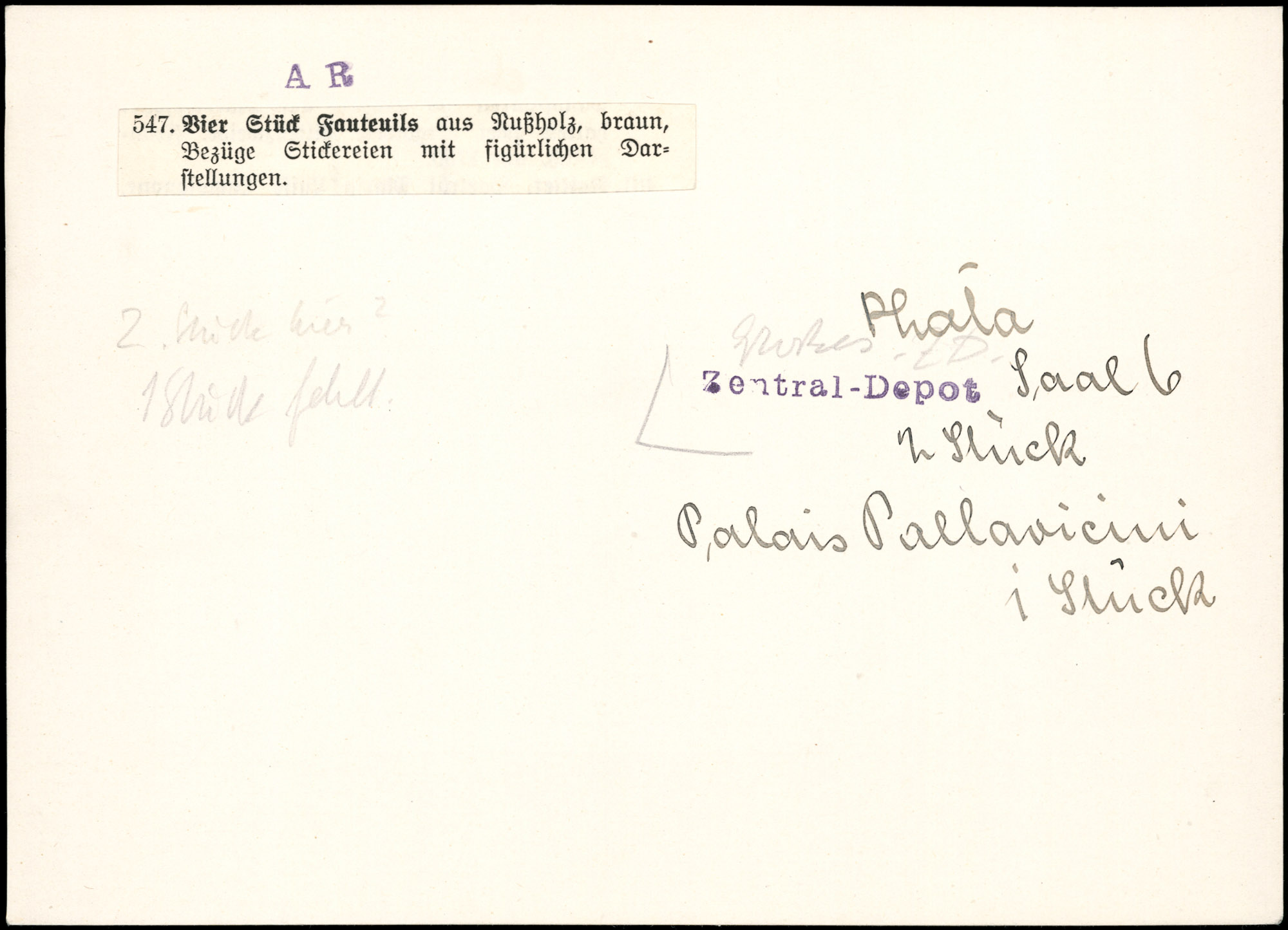 | Vier Stück Fauteuils aus Nußholz, braun, Bezüge Stickereien mit figürlichen Darstellungen. |