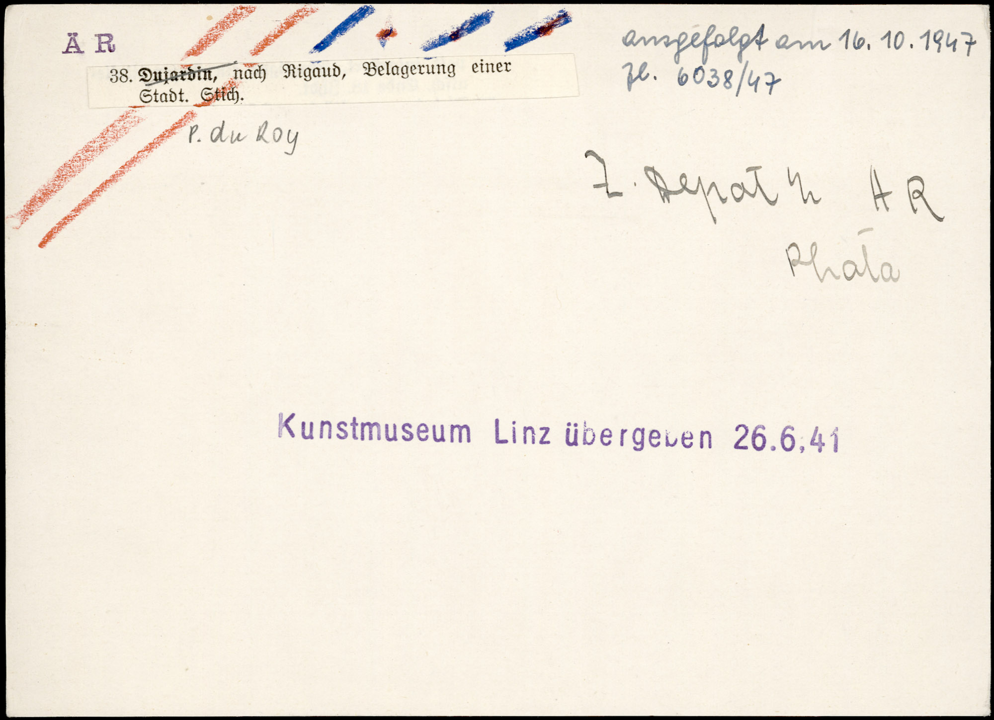 | Karteikarte Annotation | 5 Stücke Zentral-Depot No 2 Photo Kunstmuseum Linz übergeben 26.6.41 | Karteikarte: P.du Roy ausgefolgt am 16.10.1947 Zl. 6038/47 Photo Z. Depot 2 AR Kunstmuseum Linz übergeben 26.6.41. Foto: Handwerkliches Lichtbild. Julius Scherb, Wien, 6. Gumpendorferstr. 26; Ruf A 30-3-45 Mitglied der Wr. Photographenhandwerkschaft |