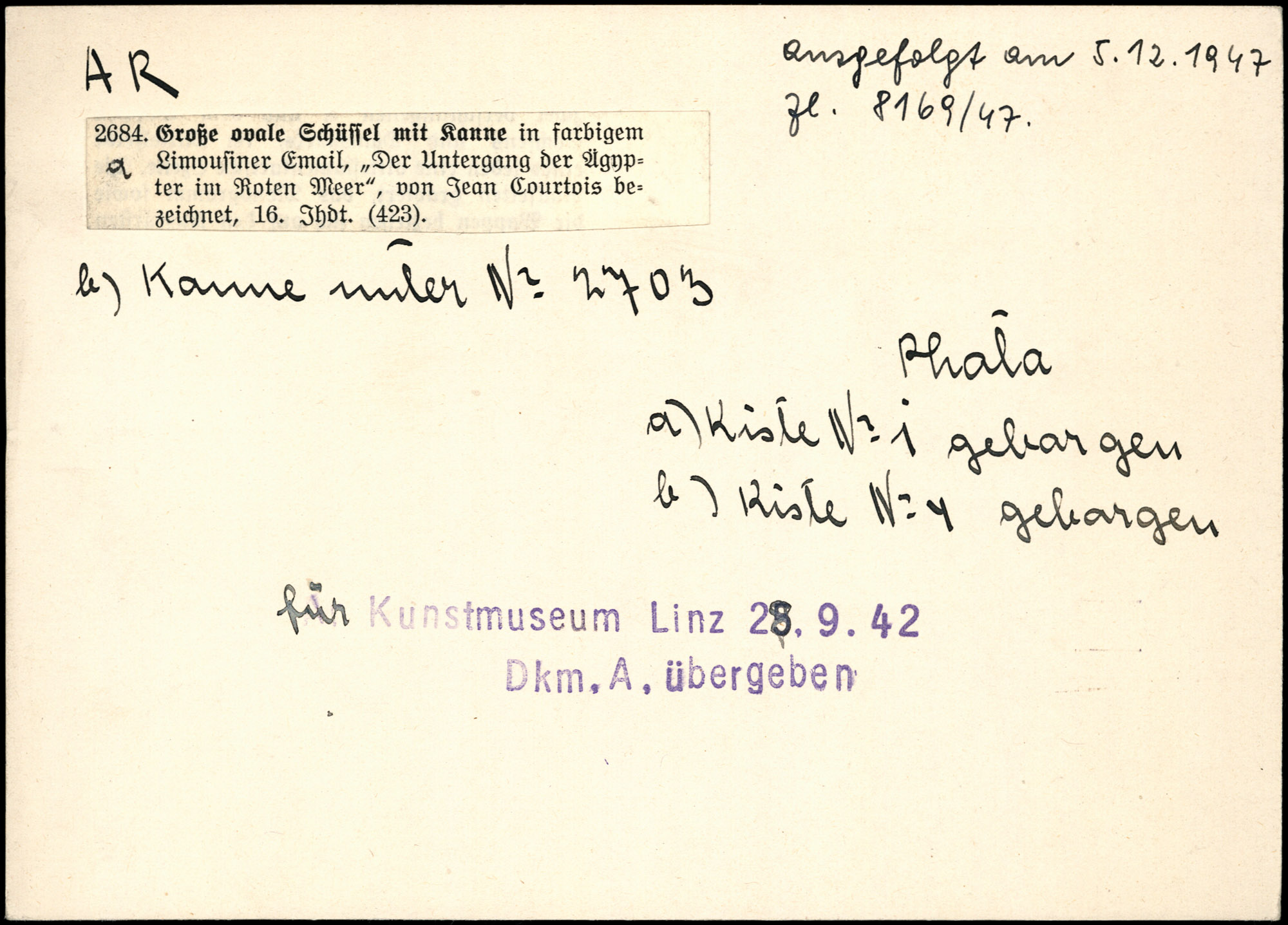 | Karteikarte Annotation | Kiste - No 1 und 4 geborgen b) Kiste 4 geborgen Photo | Karteikarte: ausgefolgt am 5.12.1947 Zl.8169/47 b) Kanne unter N°2703 Photo a) Kiste IV - 1 geborgen b) Kiste IV - 4 geborgen für Kunstmuseum Linz 25.9.42 Dkm.A. übergeben Foto: Erbeten für Kunsthistorisches Museum Wien |