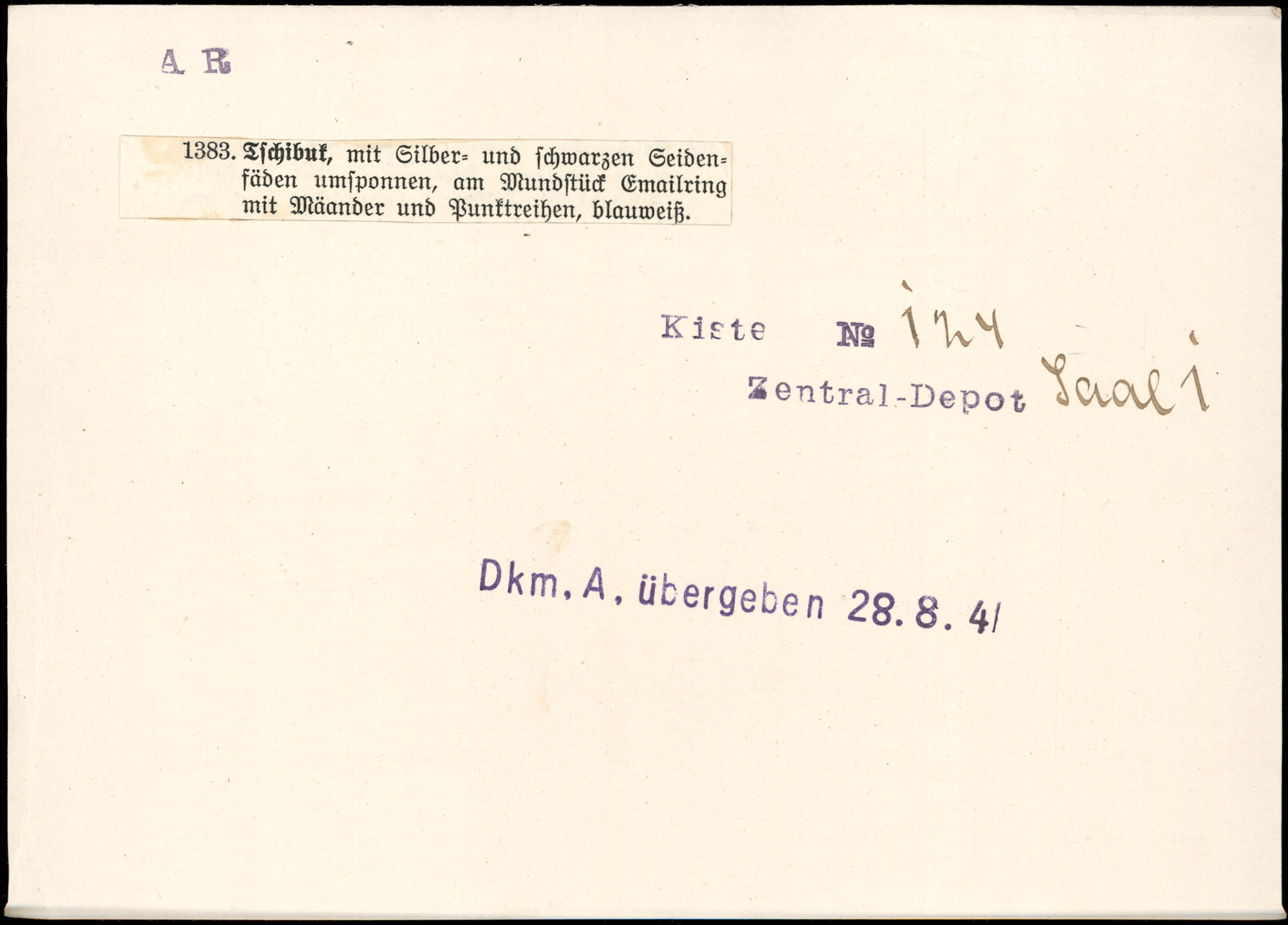 | Beschreibung | Tschibuk, mit Silber- und schwarzen Seidenfäden umsponnen, am Mundstück Emailring mit Mäander und Punktreihen, blauweiß. | |