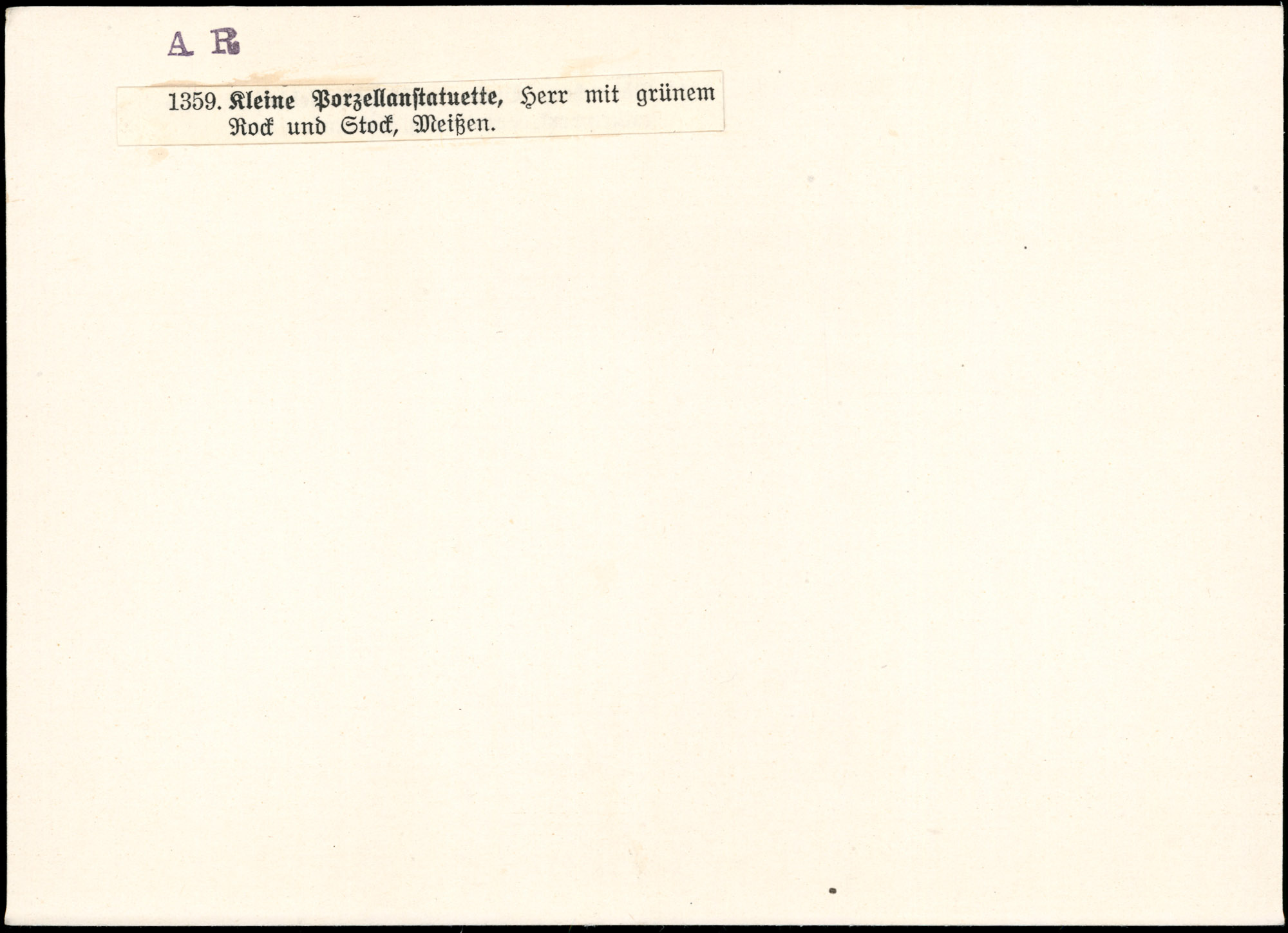 Kleine Porzellanstatuette, Herr mit grünem Rock und Stock, Meißen.