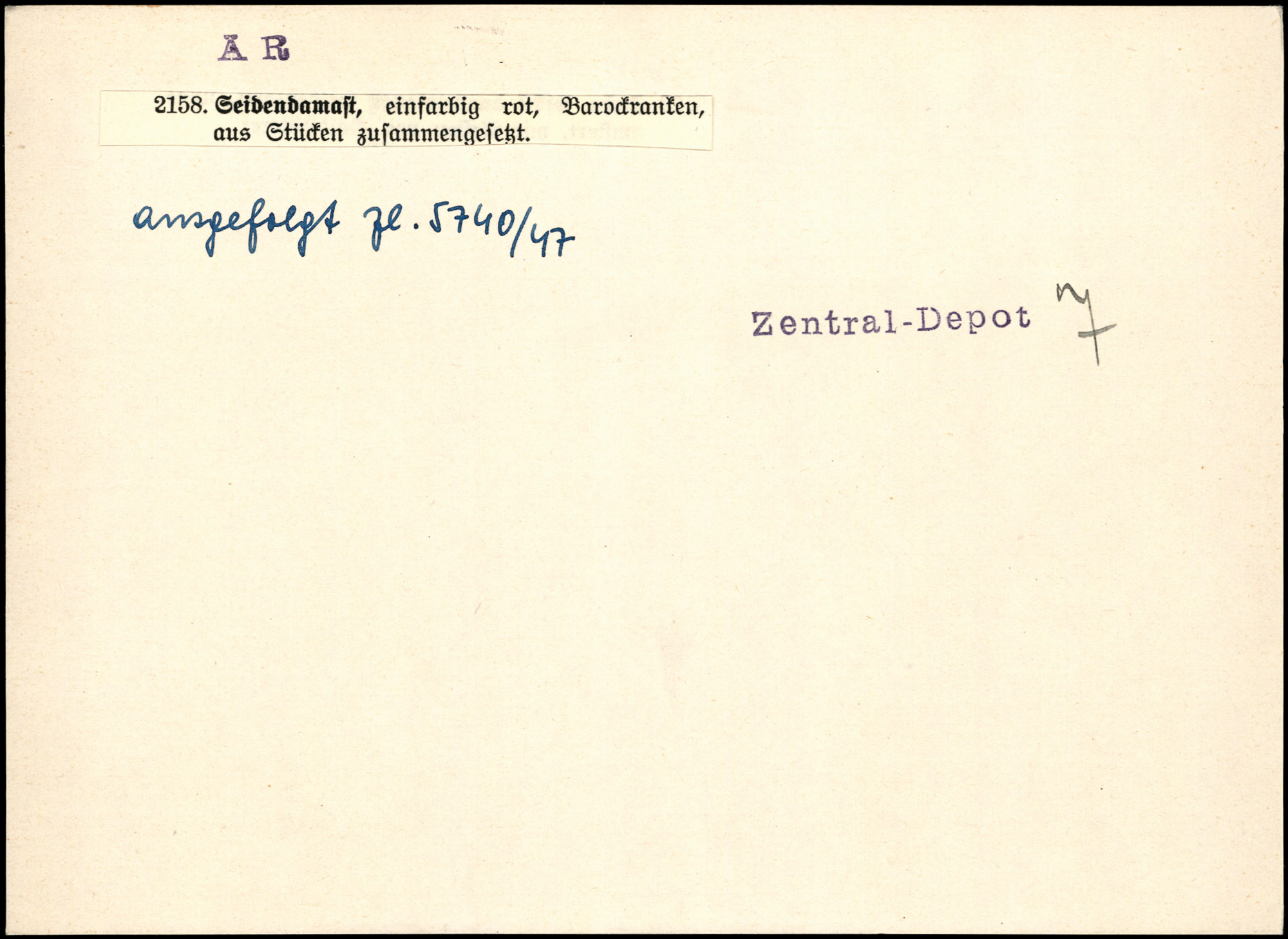 | Beschreibung | Seidendamast, einfarbig rot, Barockranken, aus Stücken zusammengesetzt. | |