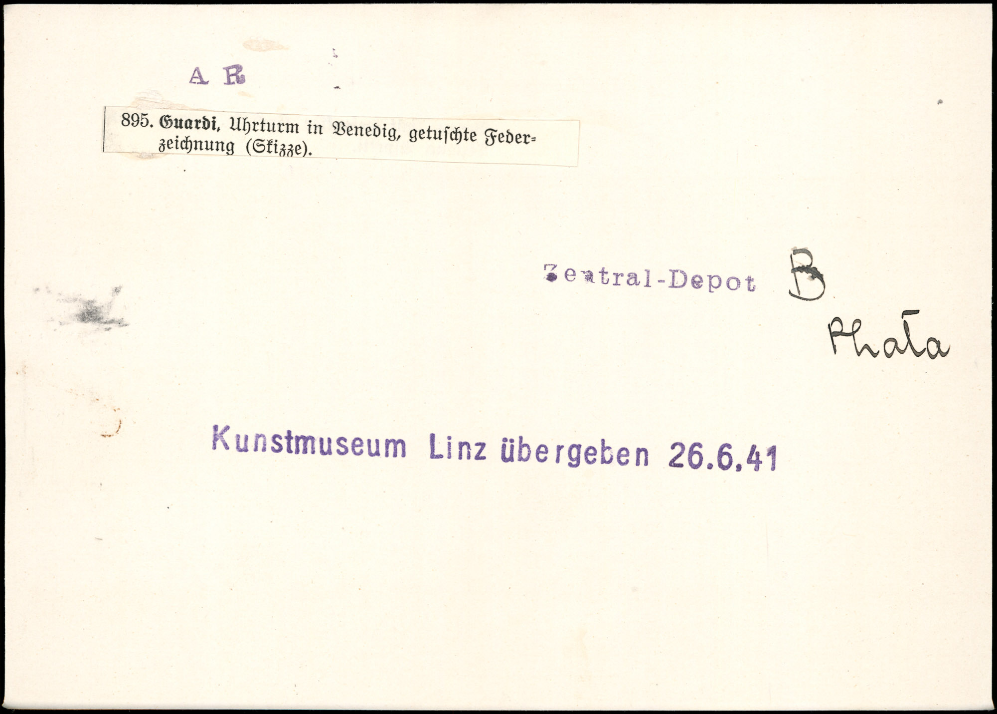 | Karteikarte Annotation | Zentral-Depot B Photo Kunstmuseum Linz übergeben 26.6.41 | Karteikarte: Zentral-Depot B Photo Kunstmuseum Linz übergeben 26.6.41 Foto: Handwerkliches Lichtbild. Julius Scherb, Wien, 6. Gumpendorferstr. 26; Ruf A 30-3-45 Mitglied der Wr. Photographenhandwerkschaft Erbeten für Akademie der Bildenden Künste Wien |