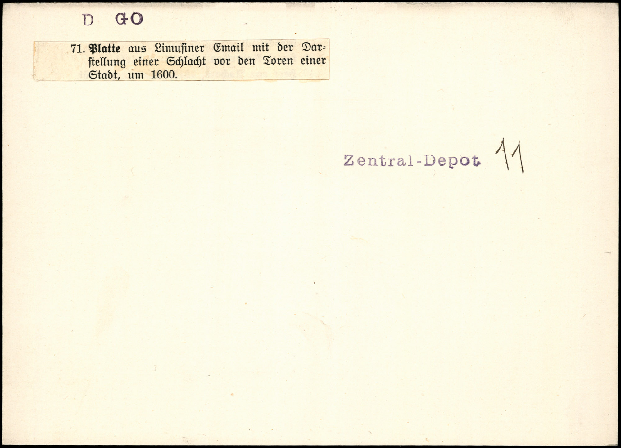 | Beschreibung | Karteikarte nicht auffindbar | Platte aus Limusiner Email mit der Darstellung einer Schlacht vor den Toren einer Stadt, um 1600. |