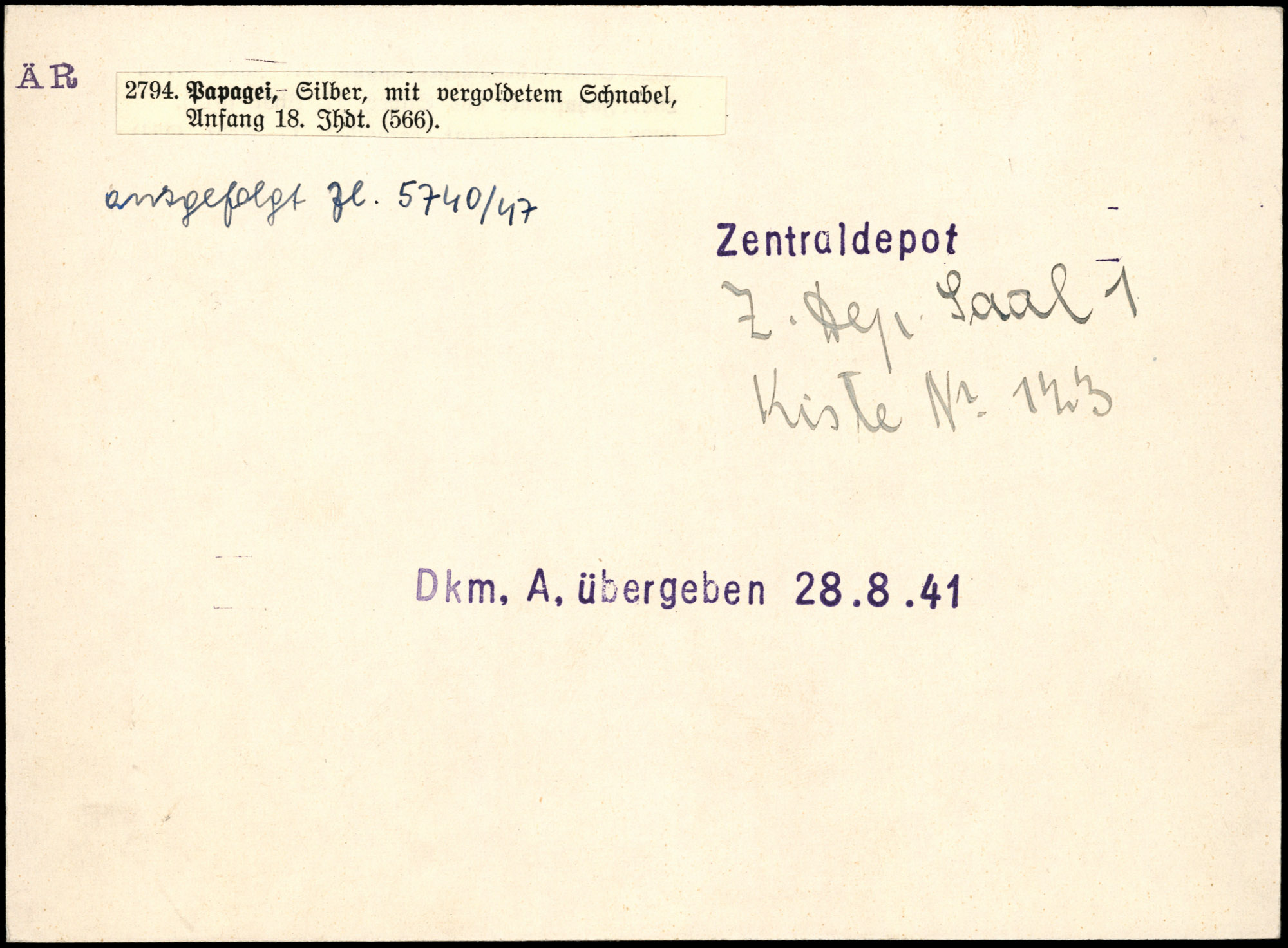 | Beschreibung | Papagei, Silber, mit vergoldetem Schnabel, Anfang 18. Jhdt. (566). | |
