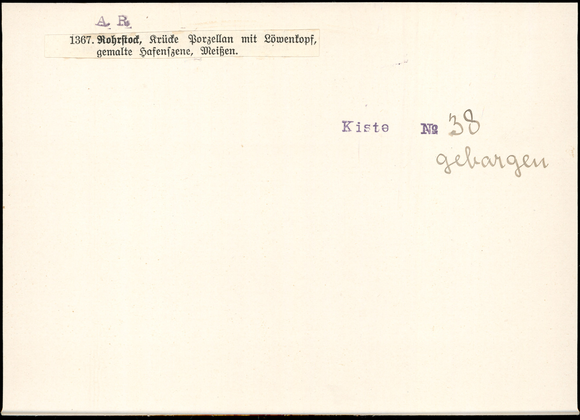 | Beschreibung | Rohrstock, Krücke, Porzellan mit Löwenkopf, gemalte Hafenszene, Meißen. | |