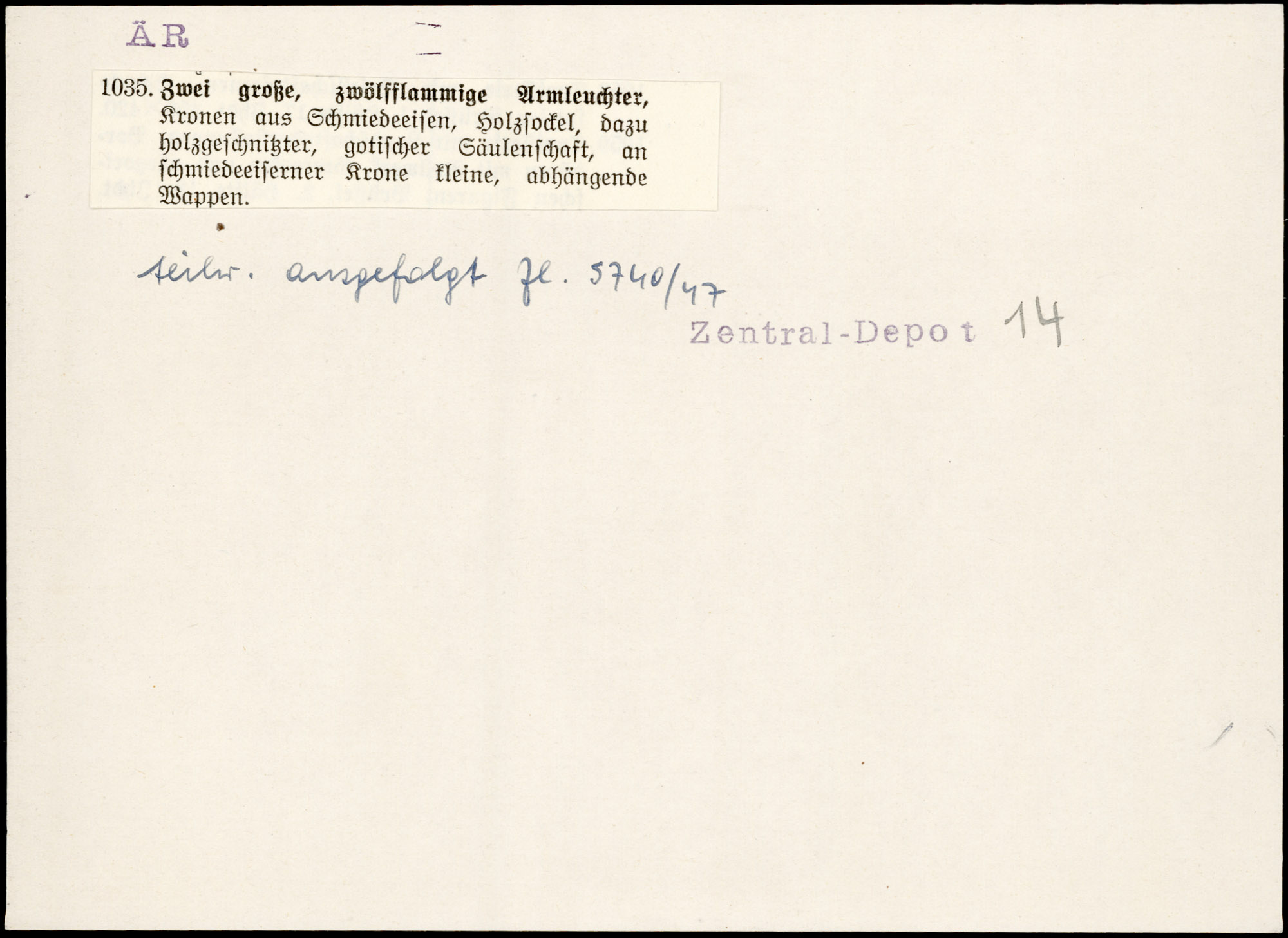 | Beschreibung | Zwei große, zwölfflammige Armleuchter, Kronen aus Schmiedeeisen, Holzsockel, dazu holzgeschnitzter, gotischer Säulenschaft, an schmiedeeiserner Krone kleine, abhängende Wappen. | |