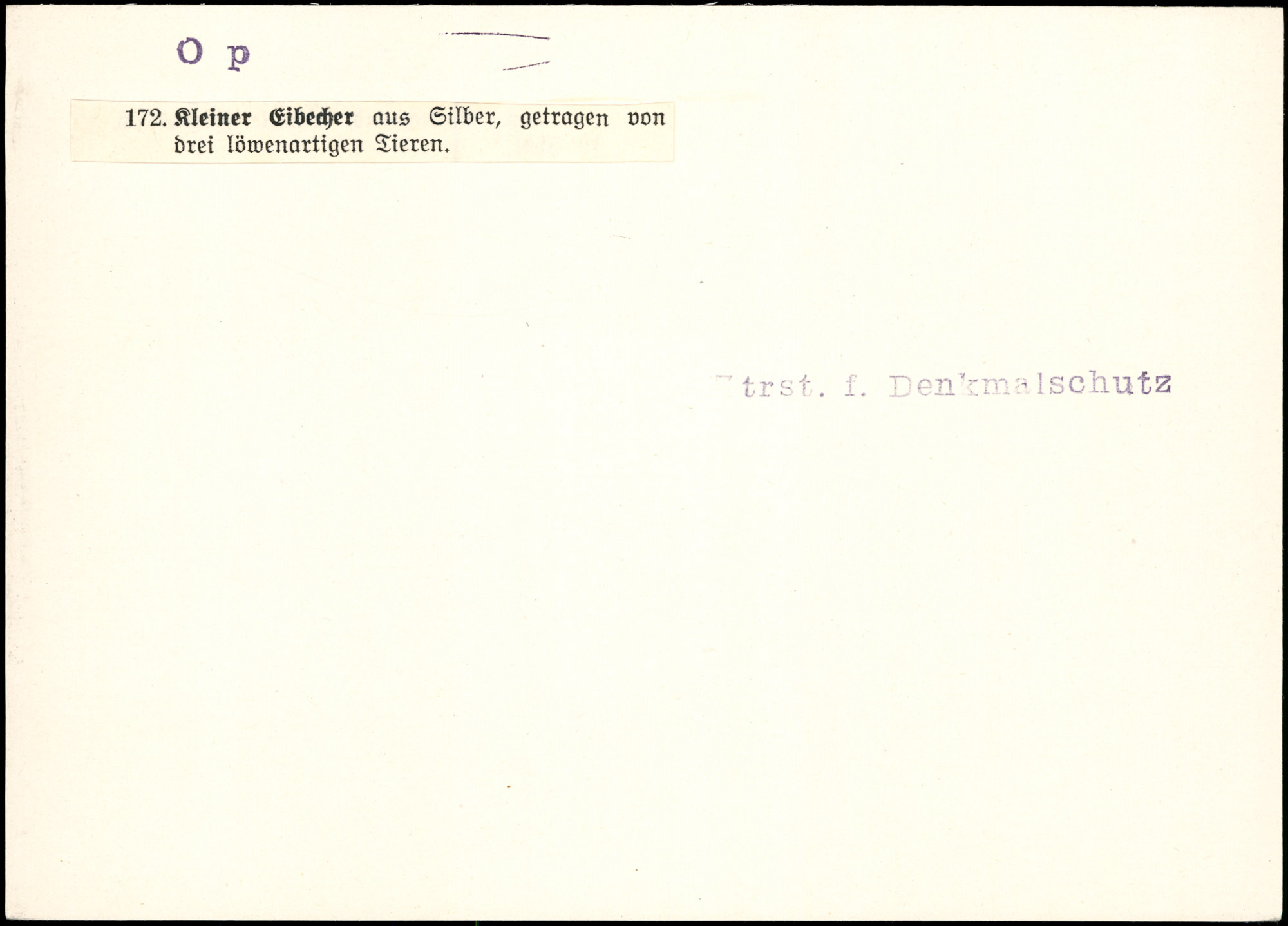 | Beschreibung | Kleiner Eibecher aus Silber, getragen von drei löwenartigen Tieren. | Karteikarte nicht auffindbar |