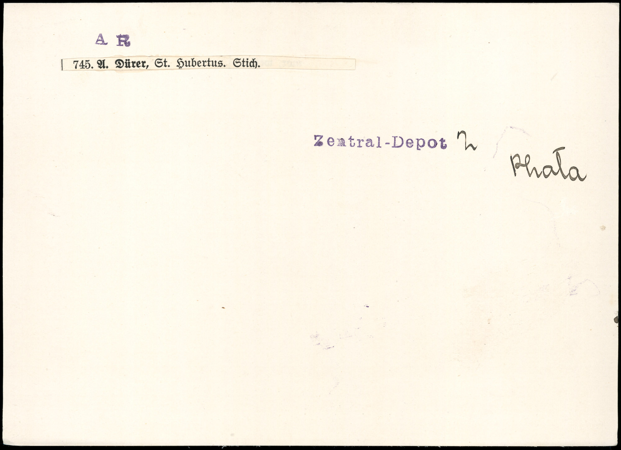 In der Sammlung von Alphonse Rothschild befanden sich, vor deren Beschlagnahmung im März 1938, Stiche von Albrecht Dürer, darunter die Pos. AR 745, „St. Hubertus“. Hans Posse teilte ihn dem Linzer Kunstmuseums zu (BDA-Archiv, K. 13, M. 2, Liste A/II, 13). Infolge der Auflösung des Zentraldepots gelangte der Stich im Juni 1941 in das Reichskunstdepot im Stift Kremsmünster (Kr. 552) und wurde von dort am 17. Jänner 1944 nach Altaussee (AA 1681) verbracht. Nach Kriegsende sollte der Stich, mit den übrigen Kunstwerken der Sammlung Alphonse Rothschild, nach München in den Central Collecting Point (CCP) gebracht und restituiert werden. Im März 1946 stellte das Bundesdenkmalamt (BDA) den Verlust von sieben Graphiken (AR 40, AR 41, AR, 313, AR 745, AR 761, AR 765, AR 879) – eine davon (AR 313) sollte später wiederaufgefunden werden – aus der Sammlung Rothschild aus dem Salzbergwerk Altaussee fest (BDA-Archiv, K. 53, M. 3, Zl. 5310/47, 10). 1947 wandte sich der Rechtsvertreter von Clarice Rothschild, Karl Trauttmansdorff, an die Restitution Division der amerikanischen Militärregierung bezüglich der verschwundenen Stiche aus der Sammlung Alphonse Rothschild, die beim BDA nachfragte (BDA-Archiv, K. 53, M. 3, Zl. 5310/47, 8). Die daraufhin eingeleiteten Ermittlungen des BDA ergaben, dass der Chemiker Max Eder die Stiche zuletzt am 15. Jänner 1945 gesehen hatte. Sie seien gerahmt gewesen, auf der Innenseite des Glases hätten sich Wassertropfen gebildet, weshalb die Graphiken durch den Gemälderestaurator Karl Sieber entrahmt und in Passepartouts gelegt worden seien. Karl Sieber erinnerte sich, den amerikanischen Offizieren im März 1946 alle Blätter gezeigt zu haben (BDA-Archiv, K. 22/3, M. 7/2, Aussage Karl Sieber). Die Rahmen wurden im Oktober 1947 restituiert (BDA-Archiv, K. 53/1, M. 4, Zl. 6038/47 und K. 53/1, M. 4a, Zl. 5905/47), die Stiche hingegen im Februar 1949 in eine „Fehlliste“ eingetragen (BDA-Archiv. K. 53/2, M. 4a). Noch 1968 waren die Stiche Gegenstand von Nachforschungen im BDA (BDA-Archiv, K. 53-1, M. 2, Memorandum, Beilage D).
