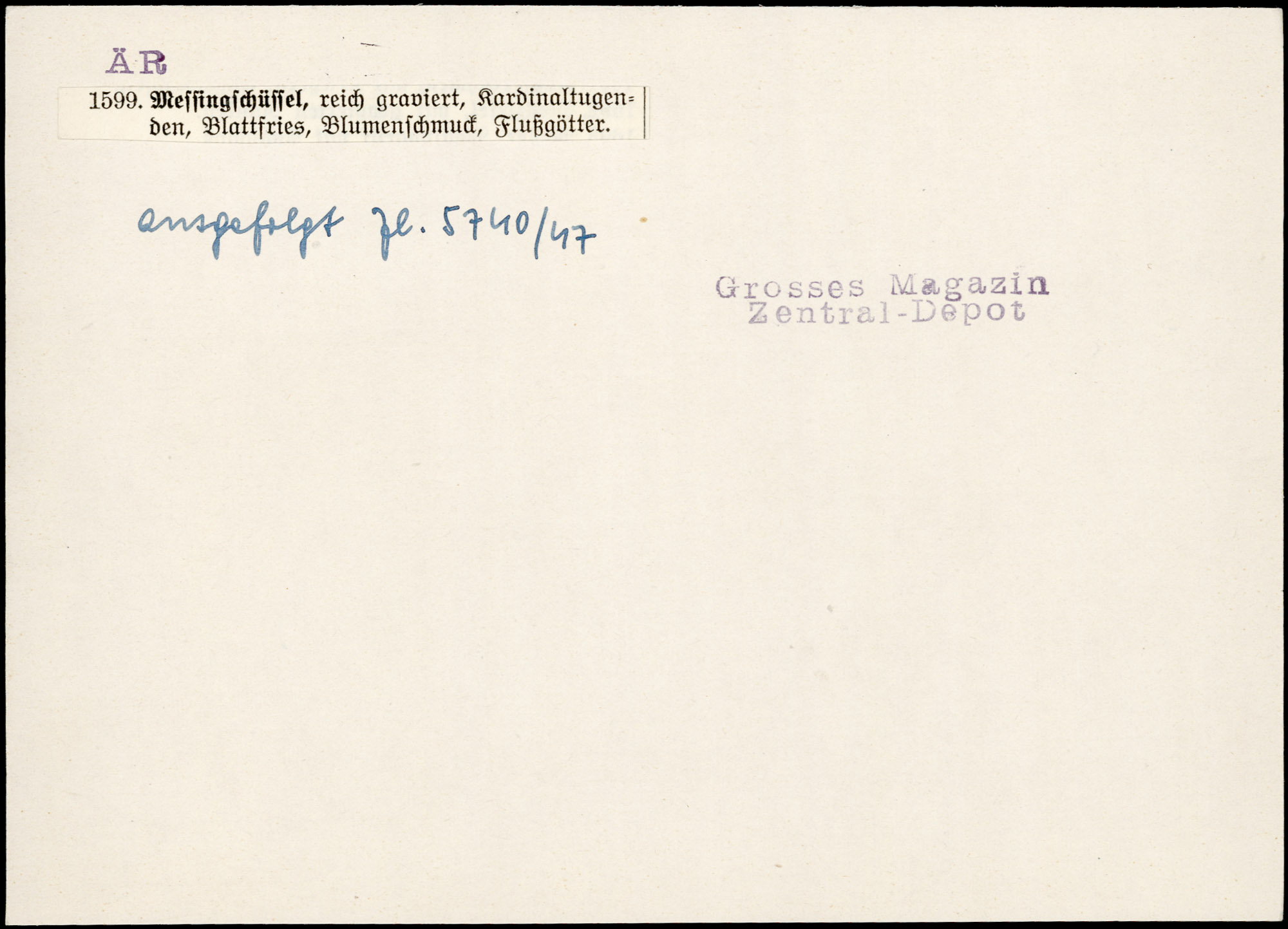 | Description | Messingschüssel, reich graviert, Kardinaltugenden, Blattfries, Blumenschmuck, Flußgötter. | |