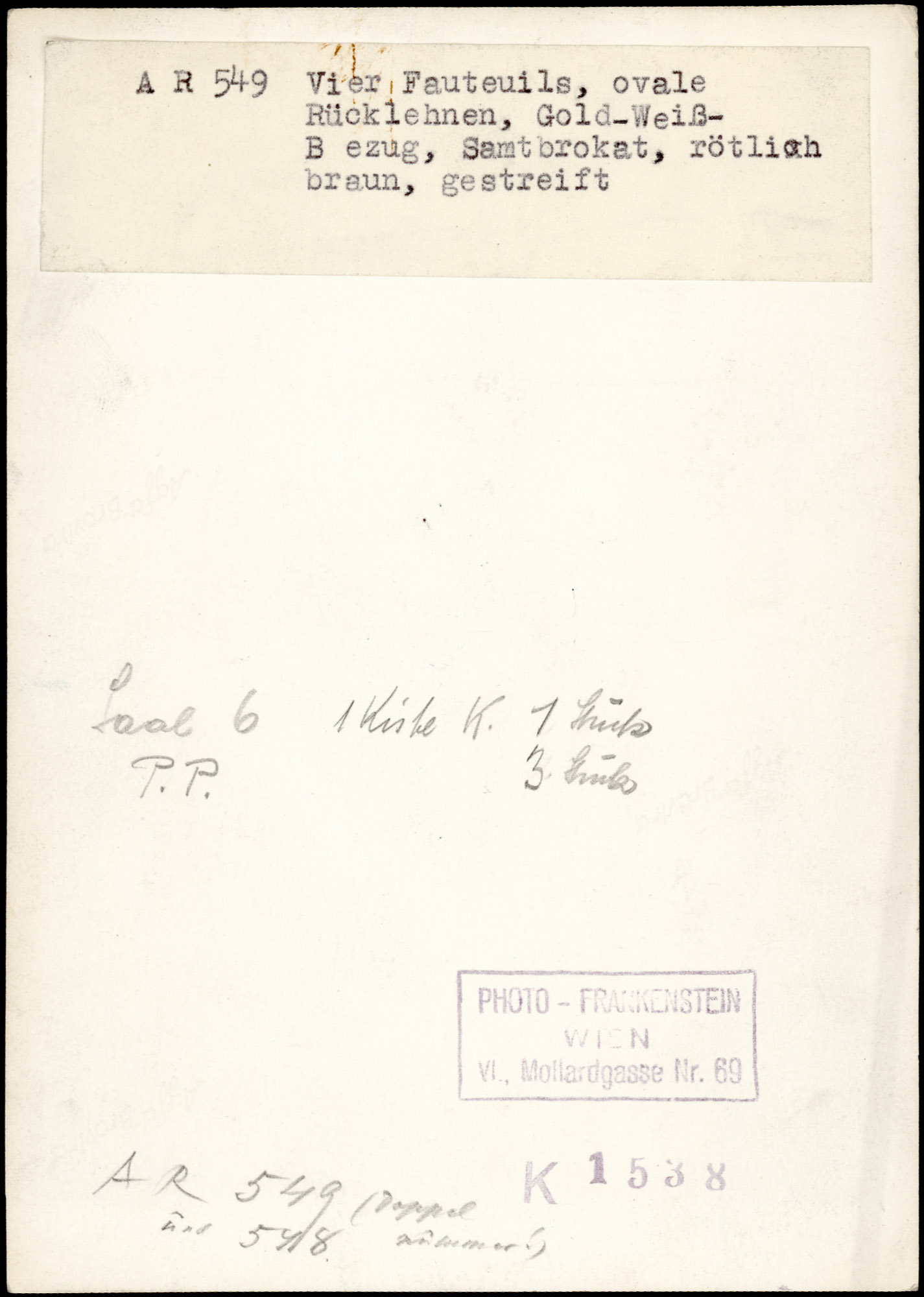 | Index card annotation | Photo Zentral-Depot Saal 6 1 Stück Palais Pallavicini 2 Stück 2 Stück Dkm.A. übergeben 7.Juli 1941 | Karteikarte: ausgefolgt Zl.5740/47, teilweise auch an 16.4.1948 Zl.7250/48 Photo 3 Stück P.Pallavicini (BA) 1 Stück Saal 6 Zentral-Depot Kiste - No K 2 Stück Dkm.A. übergeben 7.Juli 1941 Foto: Photo-Frankenstein Wien Vi., Mollardgasse Nr. 69 K 1538 |