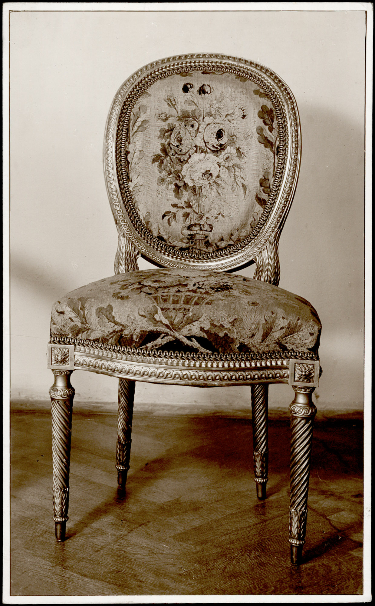 | Description | Vier Fauteuils, ovale Rückenlehnen, Bezug wie oben, Einsatzpolster. | |