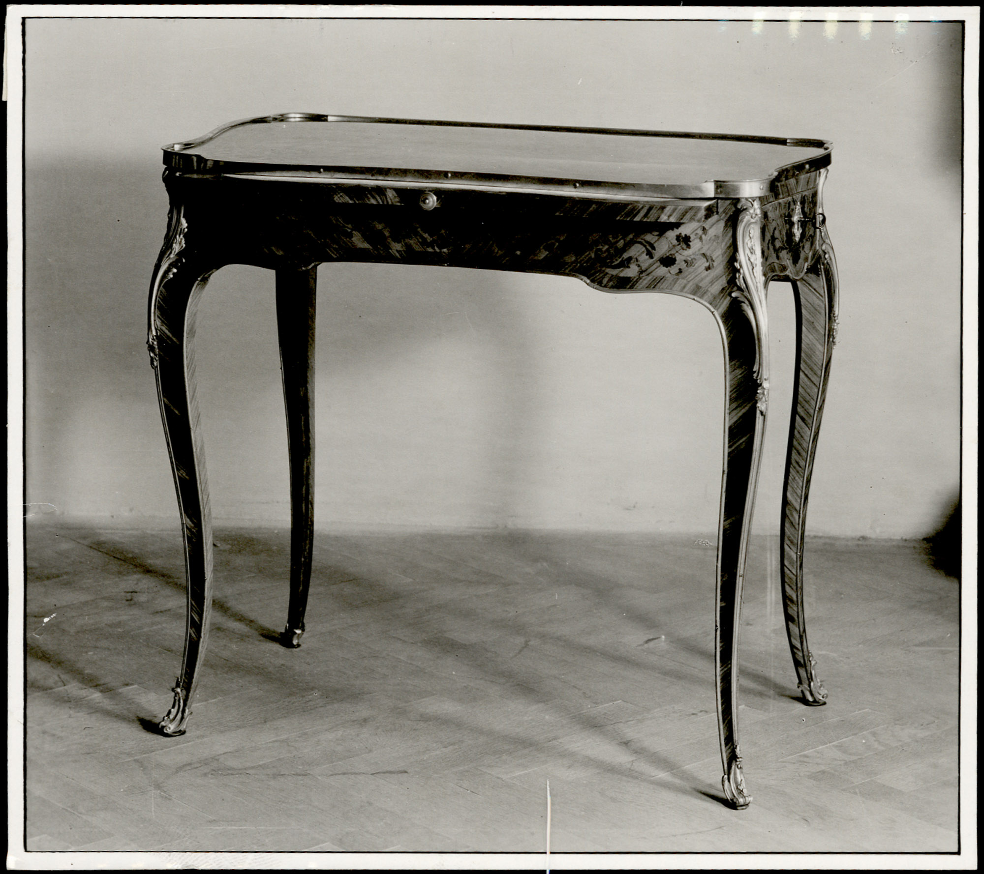 | Description | Tischchen mit herausziehbarer Schreibplatte und zwei seitlichen Laden, Intarsien in Blütenmuster und Netz, Rosenholz und Königsholz, vergoldete Bronzebeschläge. | |