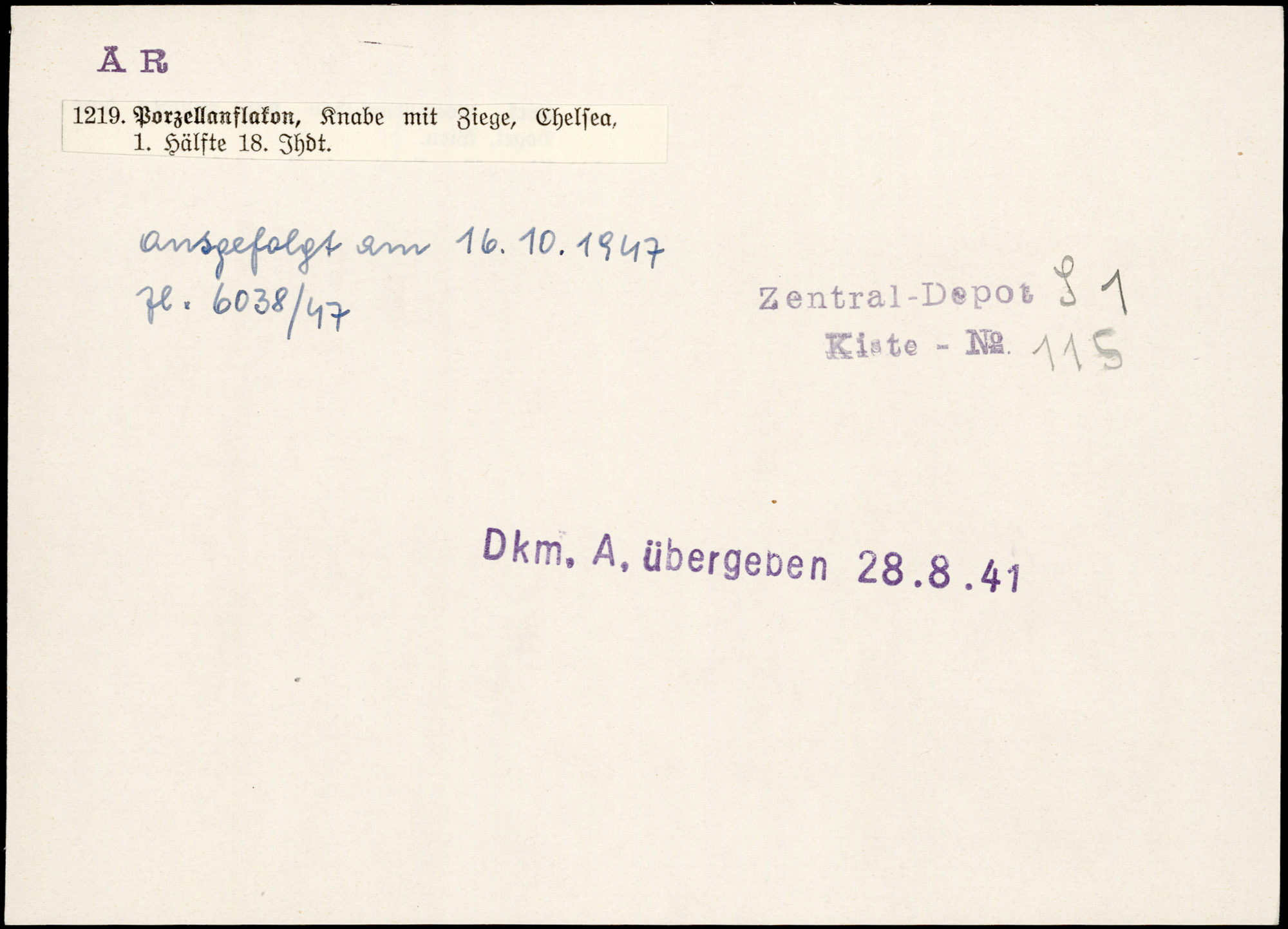 | Index card annotation | Zentral-Depot Saal 1 Kiste - No 115 Dkm.A. übergeben 28.8.41 | ausgefolgt am 16.10.1947 Zl. 6038/47 Zentral-Depot S.1 Kiste-No 115 Dkm.A. übergeben 28.8.41 |