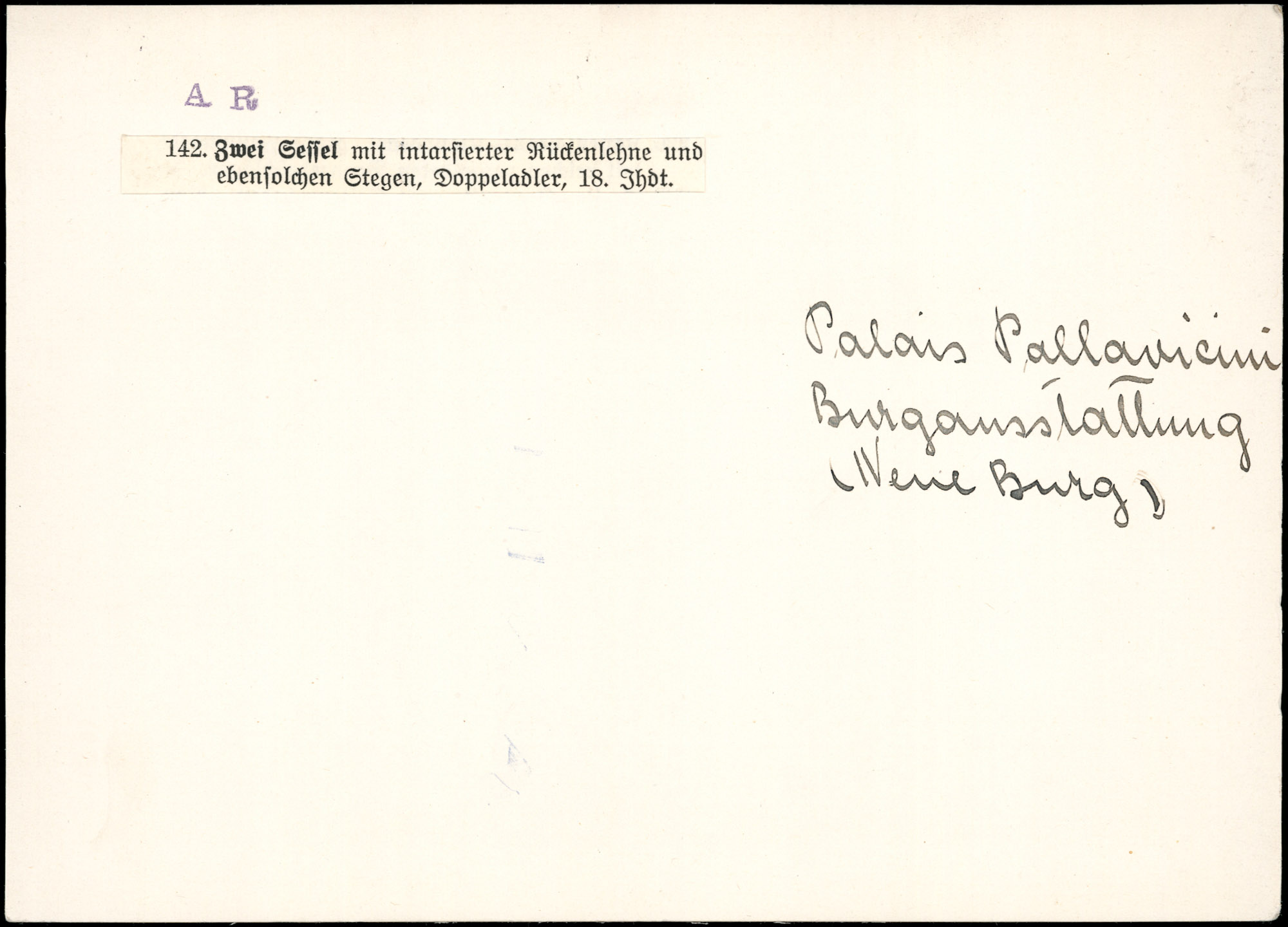 | Description | Zwei Sessel mit intarsierter Rückenlehne und ebensolchen Stegen, Doppeladler, 18. Jhdt. | |