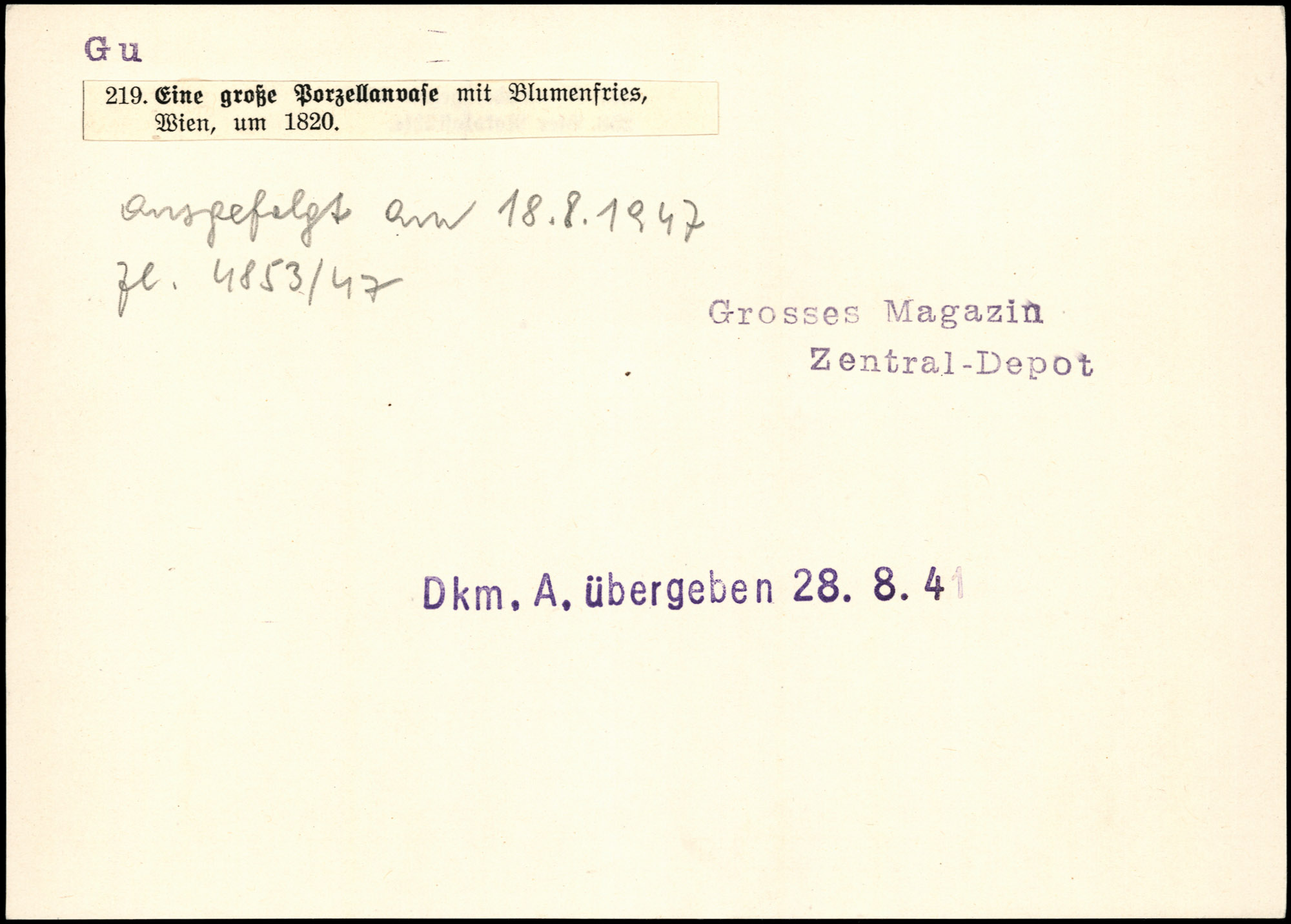 | Index card annotation | Großes Magazin Zentral-Depot Dkm.A. übergeben 28.8.41 | ausgefolgt am 18.8.1947 Zl.4853/47 Großes Magazin Zentral-Depot Dkm.A. übergeben 28.8.41 |