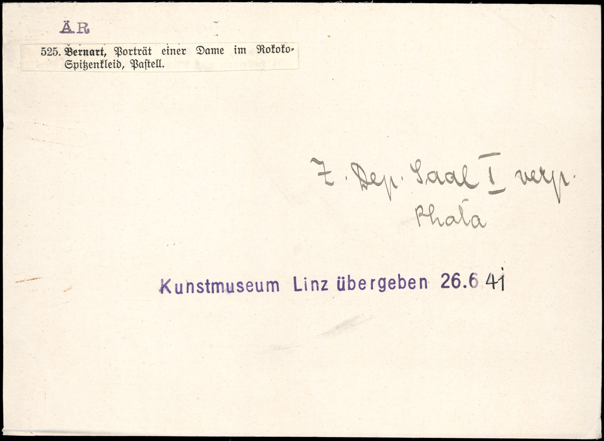 | Index card annotation | Z.Dep. Saal I verp. Photo Kunstmuseum Linz übergeben 26.6.41 | Karteikarte: ausgefolgt am 16.10.1947 Zl.6038/47 Zentral-Depot B Photo Kunstmuseum Linz übergeben 26.6.41 Foto: Handwerkliches Lichtbild. Julius Scherb, Wien, 6. Gumpendorferstr. 26; Ruf A 30-3-45 Mitglied der Wr. Photographenhandwerkschaft Erbeten für Gemäldegalerie Wien |