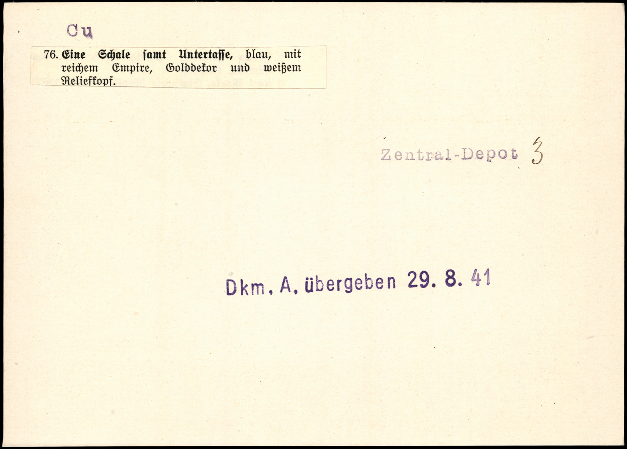 | Index card annotation | Zentral-Depot 3 Dkm.A. übergeben 29.8.41 | |