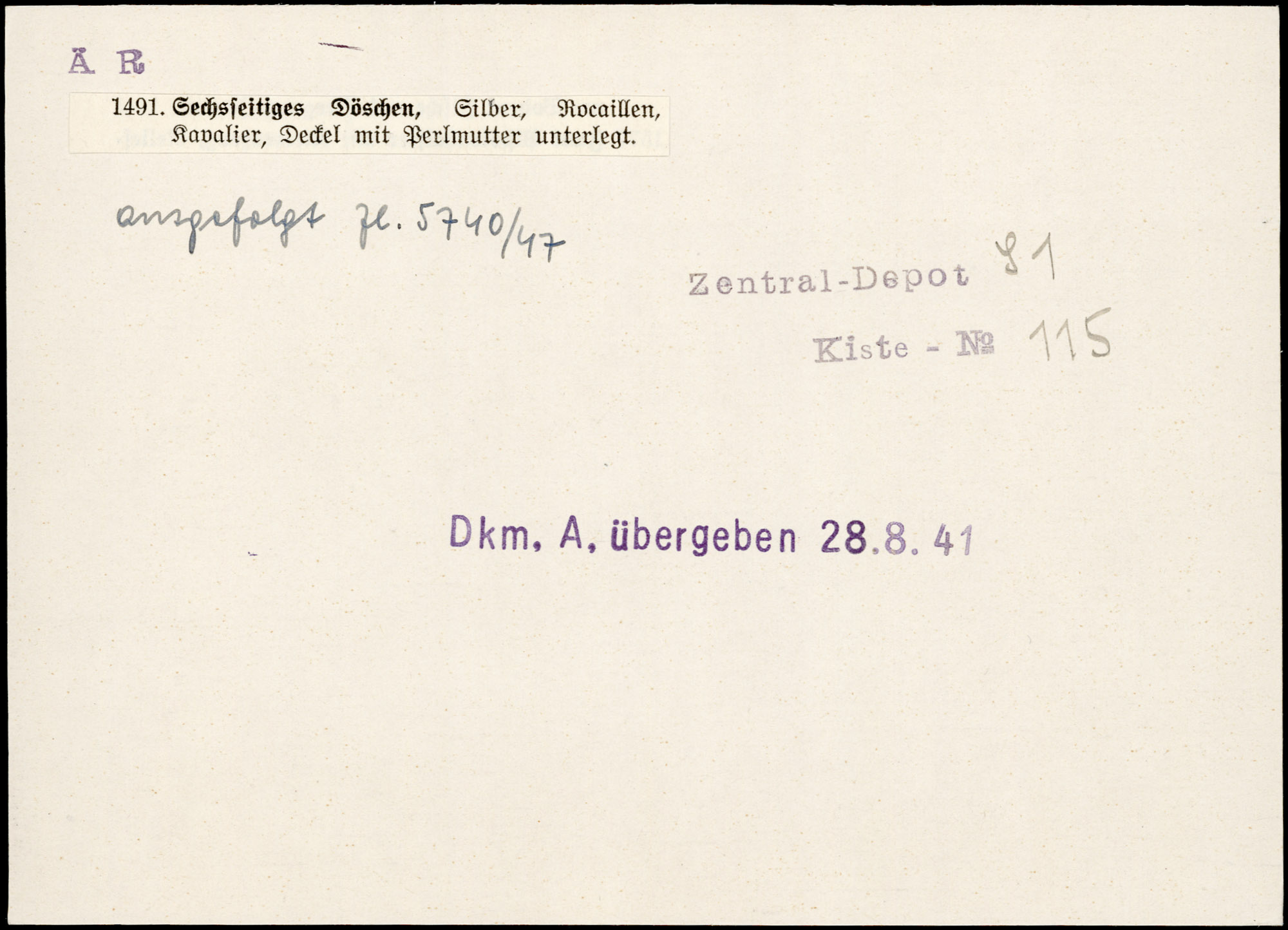 | Index card annotation | Zentral-Depot Saal 1 Kiste - No 115 Dkm.A. übergeben 28.8.41 | ausgefolgt Zl.5740/47 Zentral-Depot S.1 Kiste - No 115 Dkm.A. übergeben 28.8.41 |