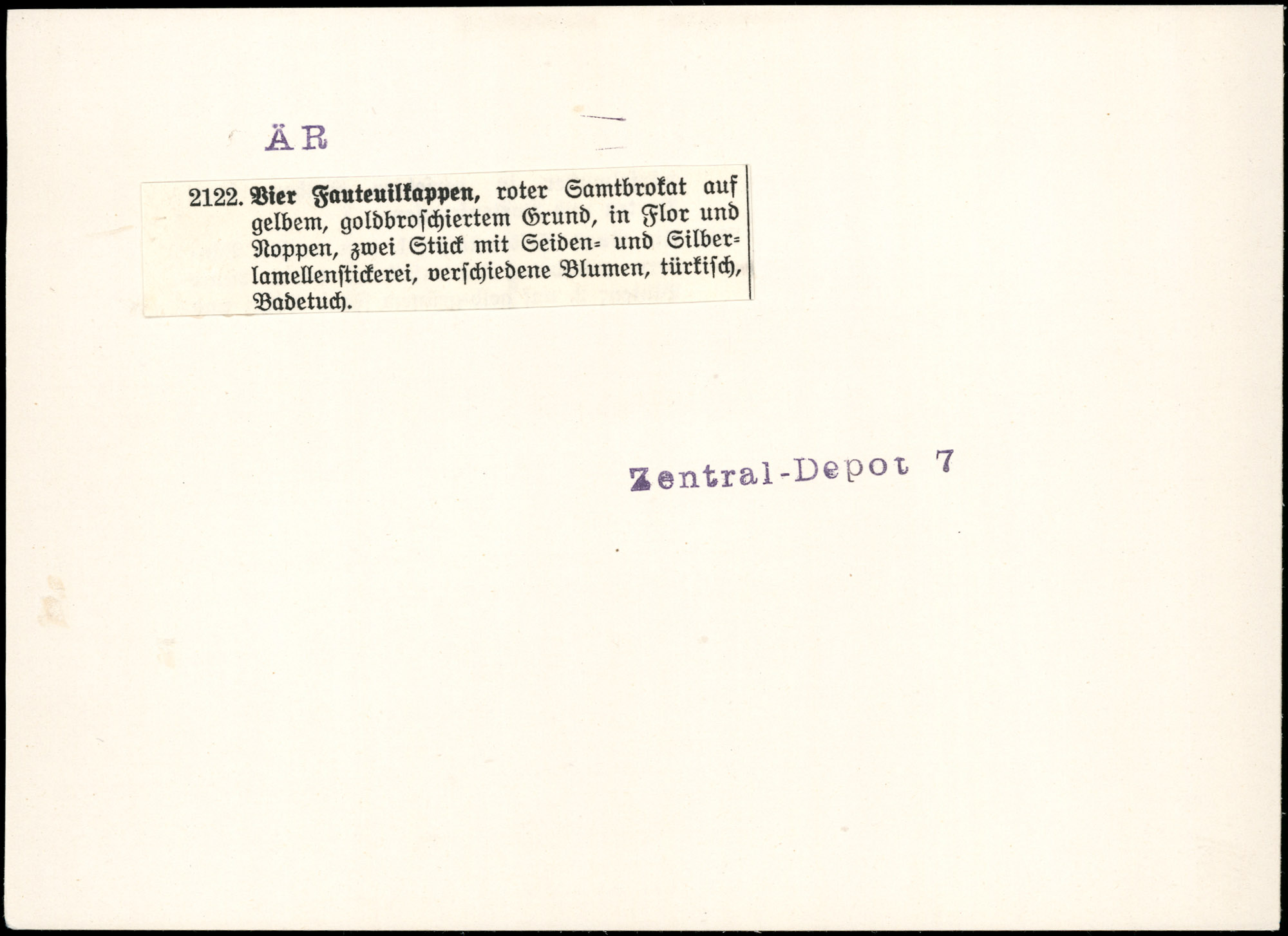 | Description | Vier Fauteuilkappen, roter Samtbrokat auf gelbem, goldbroschiertem Grund, in Flor und Noppen, zwei Stück mit Seiden- und Silberlamellenstickerei, verschiedene Blumen, türkisch, Badetuch. | |