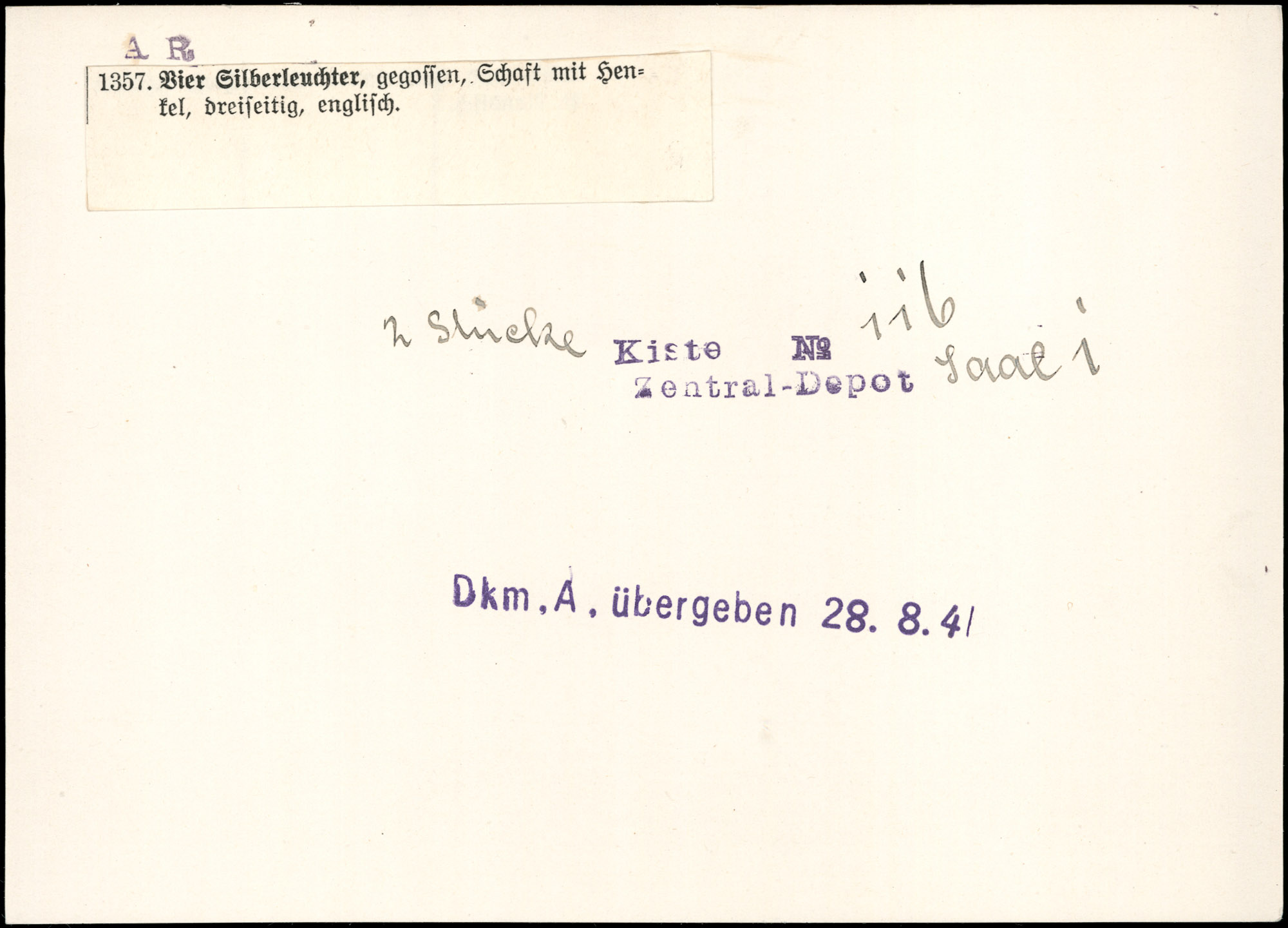 | Index card annotation | 2 Stücke Kiste - No 116 Zentral-Depot Saal 1 Dkm.A. übergeben 28.8.41 | ausgefolgt Zl.5740/47 Zentral-Depot S.1 2 Stück Kiste - No 116 a)b) Dkm.A. übergeben 28.8.41 |