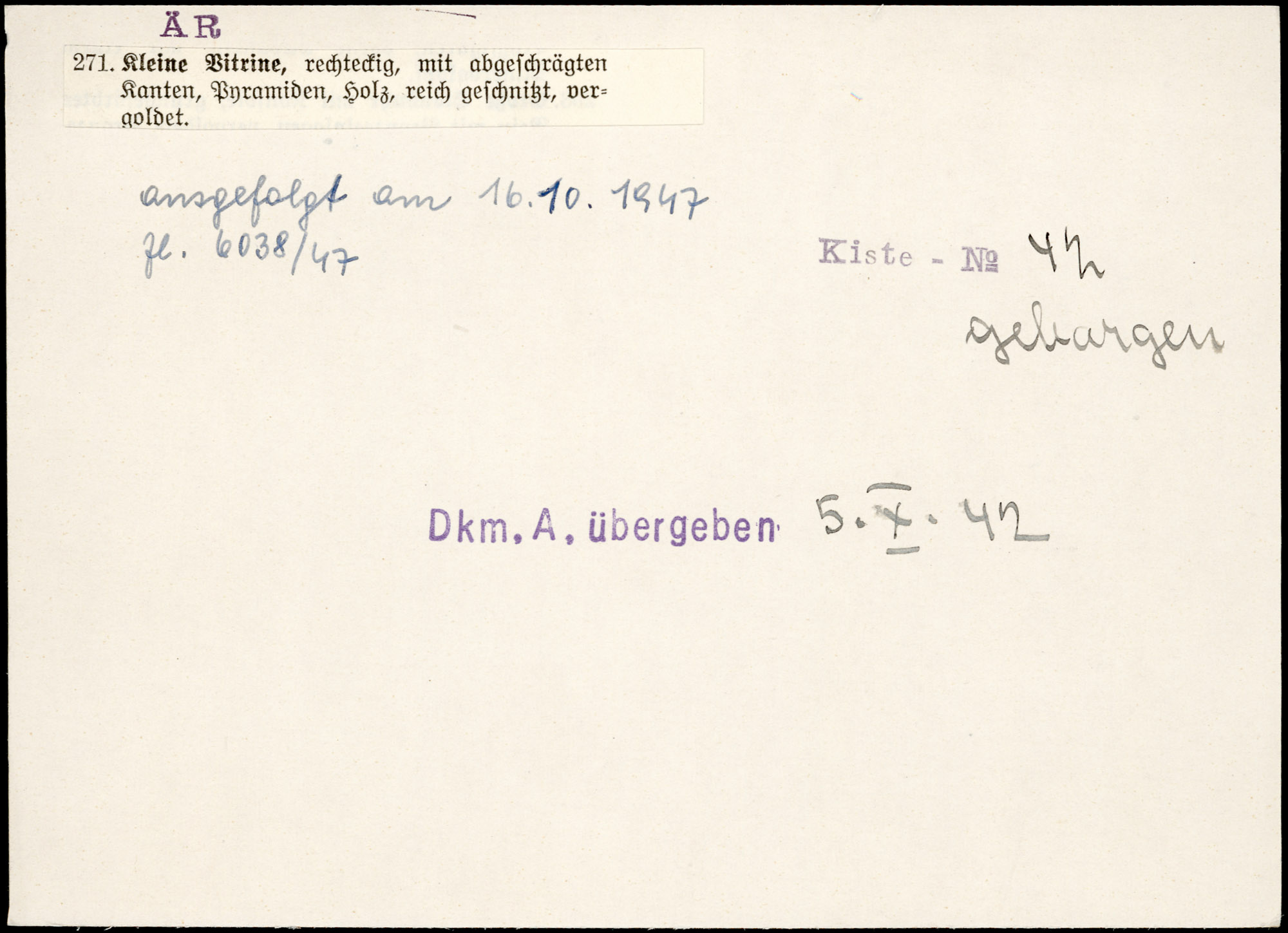 | Index card annotation | Kiste 42 geborgen Photo | ausgefolgt am 16.10.1947 Zl.6038/47 Kiste - No 42 geborgen Dkm.A. übergeben 5.X.42 |