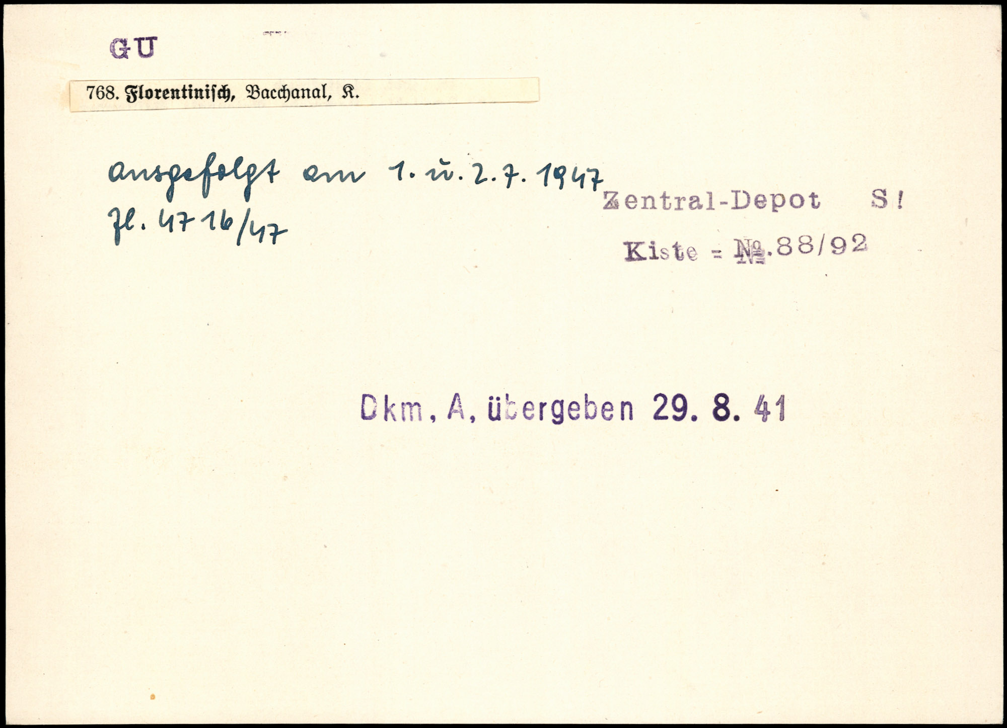| Index card annotation | Zentral-Depot Kiste - No 88/92 Dkm.A. übergeben 29.8.41 | ausgefolgt am 1. u. 2.7.1947 Zl.4716/47 Kiste - No 88/92 Zentral-Depot S.1 Dkm.A. übergeben 29.8.41 |