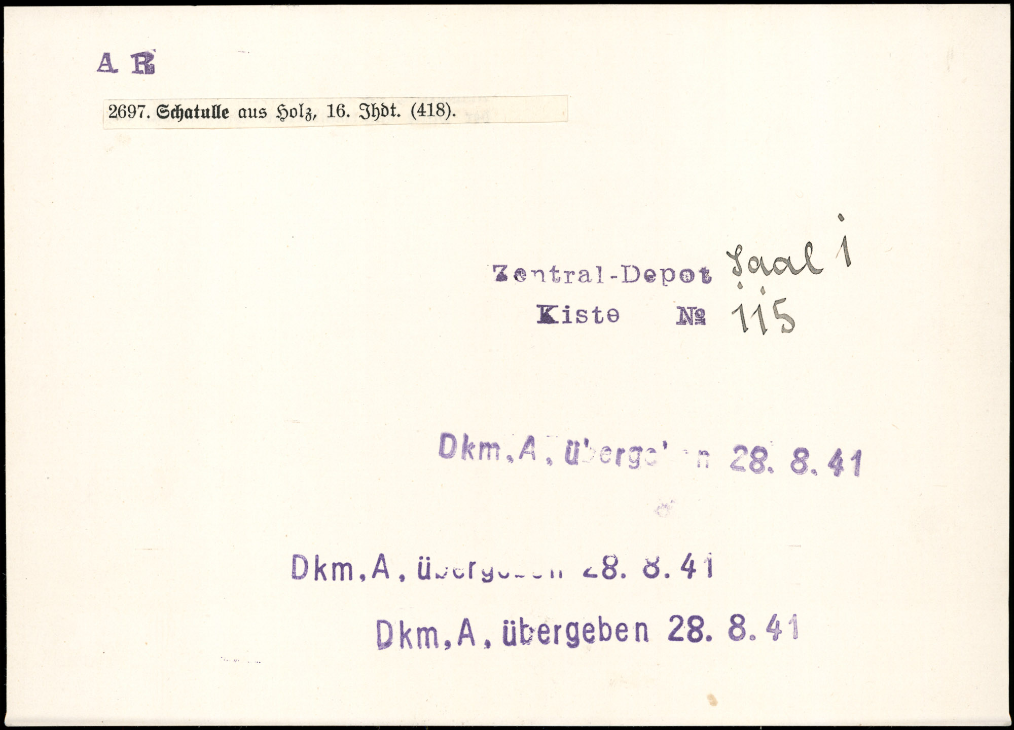 | Index card annotation | Zentral-Depot Saal 1 Kiste - No 115 Dkm.A. übergeben 28.8.41 Dkm.A. übergeben 28.8.41 Dkm.A. übergeben 28.8.41 | ausgefolgt Zl.5907/48 Kiste - No 115 Zentral-Depot Saal 1 Dkm.A. übergeben 28.8.41 |