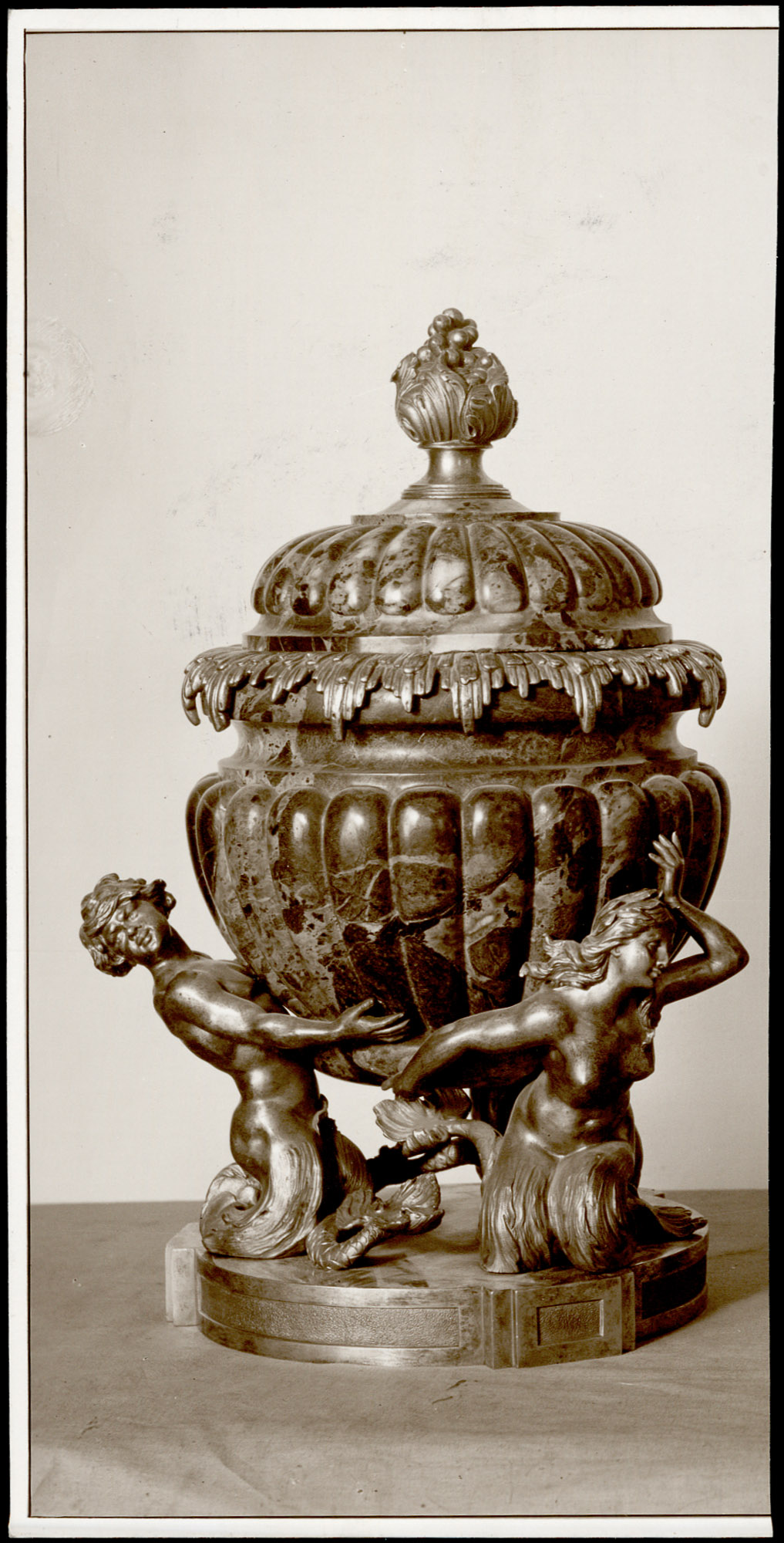 | Zwei Deckelvasen, urnenförmig, aus grünem Syenit, Rajaden und Tritonen als Tragfiguren in vergoldeter Bronze montiert, französisch, 2. Hälfte 18. Jhdt. |