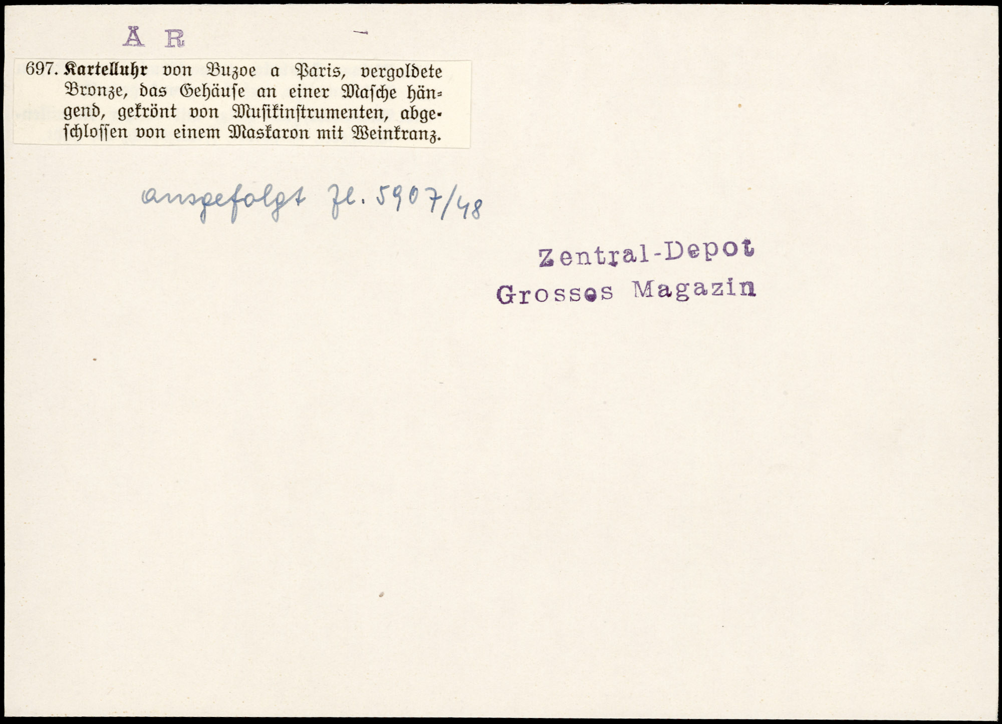 | Karteikarte Annotation | Großes Magazin Zentral-Depot | ausgefolgt Zl.5907/48 Zentral-Depot Großes Magazin |