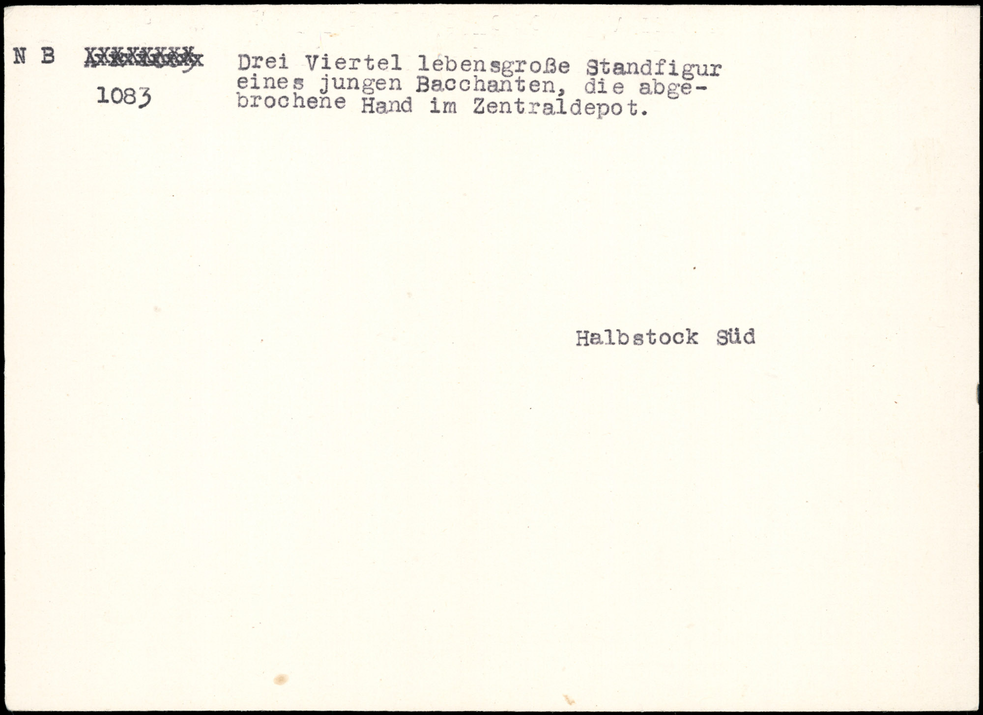 | Beschreibung | Drei Viertel lebensgroße Standfigur eines jungen Bacchanten, die abgebrochene Hand im Zentraldepot. | Karteikarte nicht auffindbar |